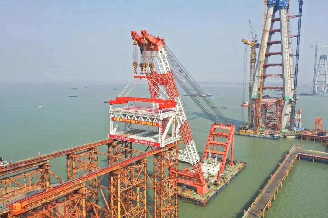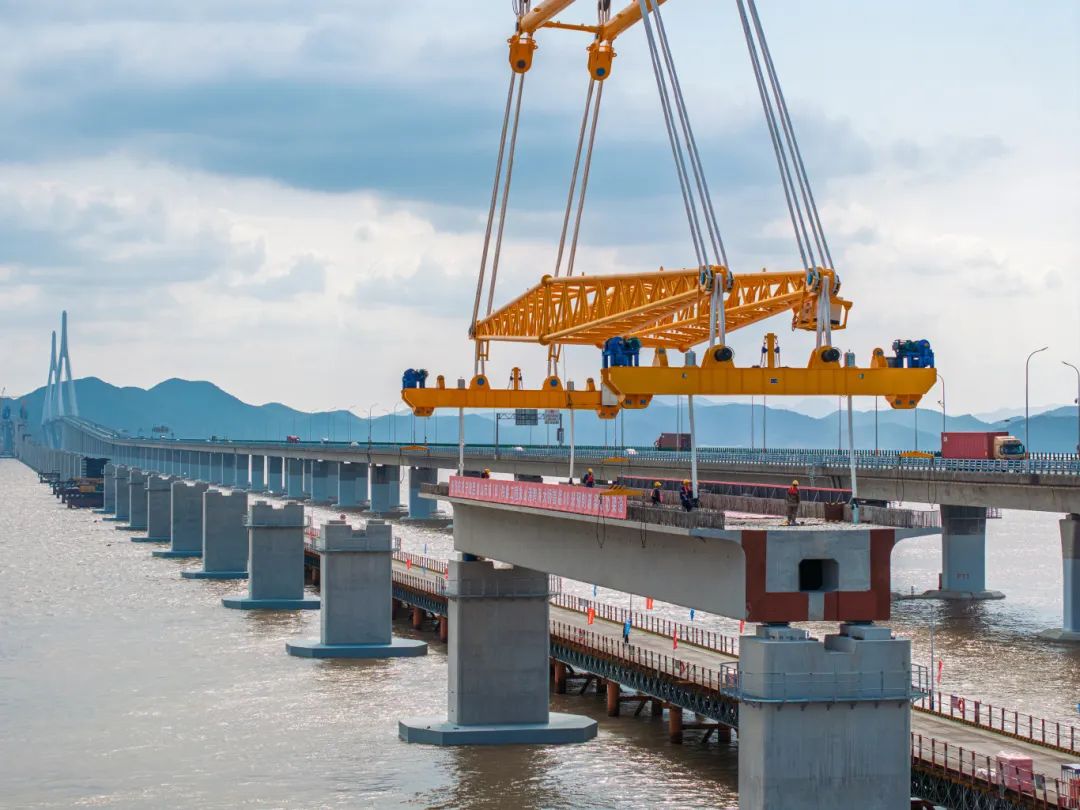 巨力索具箱梁吊具全部确定亚太首坐市域(郊)铁路桥跨海江特大桥——象山线跨海江特大桥,重1700吨的预制件箱梁成功搭设。