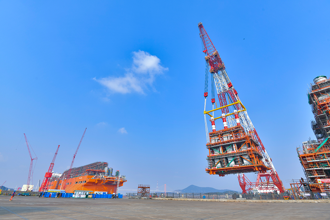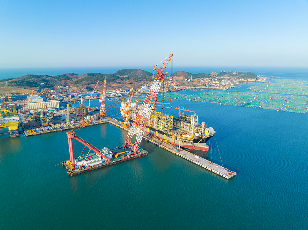 巨力索具5000T吊梁管理体制四轮驱动我过独立做的极大吨数、极大储宇量的最新型海洋上浮式煤气生态气主产地装配线NGUYA FLNG上面引擎起重吊装顺利,为险遭目标任务开工奠基仪式了坚硬本质上。