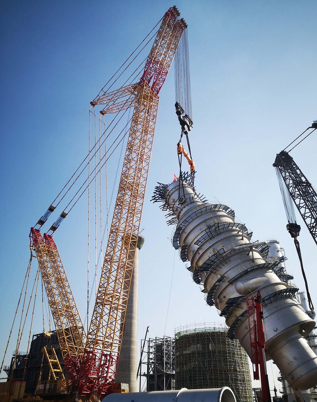 𒅌巨力索具的2000t级均衡梁、无讨论绳圈,将盛虹炼化一体化名目常减压蒸馏装配中直径14米,高58米,吊重1717吨的减压塔顺遂吊装就位。