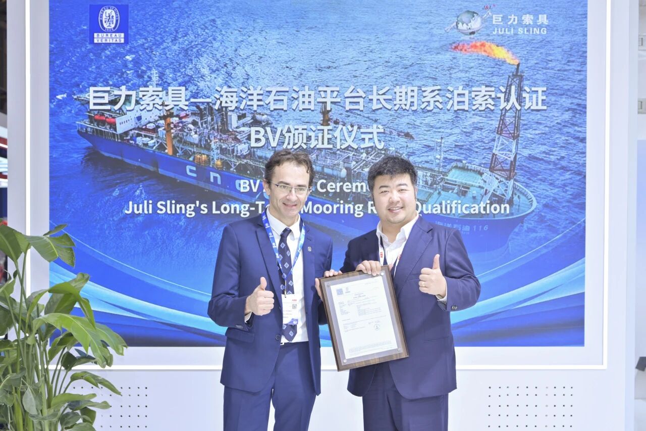 在2025中国国际海事会展时代,法国船级社(BV)向巨力索具颁发了“陆地煤油平台持久系泊索”专项认证证书。这项认证是针对陆地煤油平台持久系泊索这一手艺门坎范畴的专项认证,是对巨力索具深耕深海设备手艺的最好注脚。