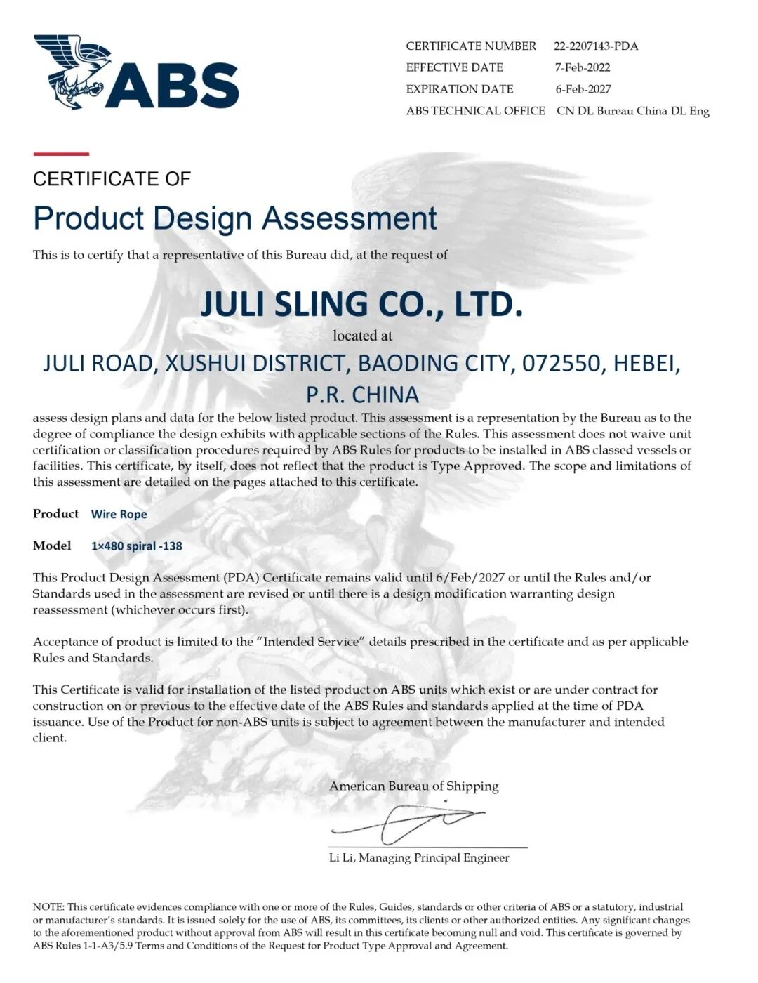 △ 法国船级社(BV)为巨力索具颁发证书美国船级社(ABS)